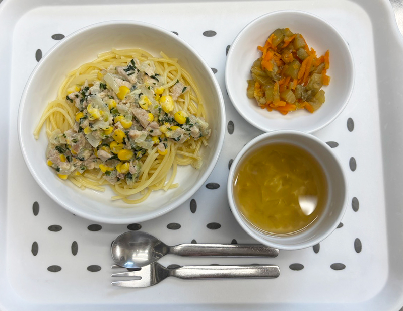 鶏肉とお野菜のソースとスパゲティの相性がよく、ぱくぱく食べ進める子が多かったです。