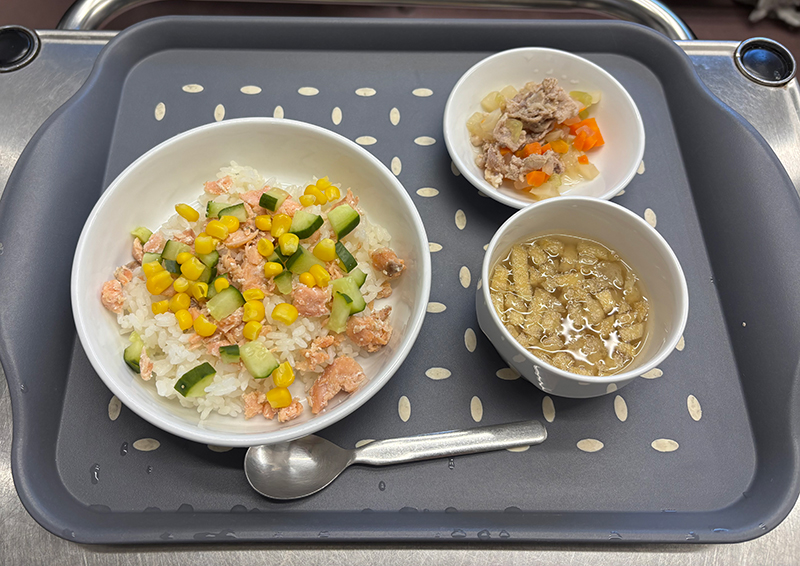 この日は見た目にも鮮やかな鮭ちらし寿司でした。子どもたちも食べやすい鮭は骨や脳の発達にもとても良いお魚です。秋にぴったりのメニューをもりもり食べてくれました。