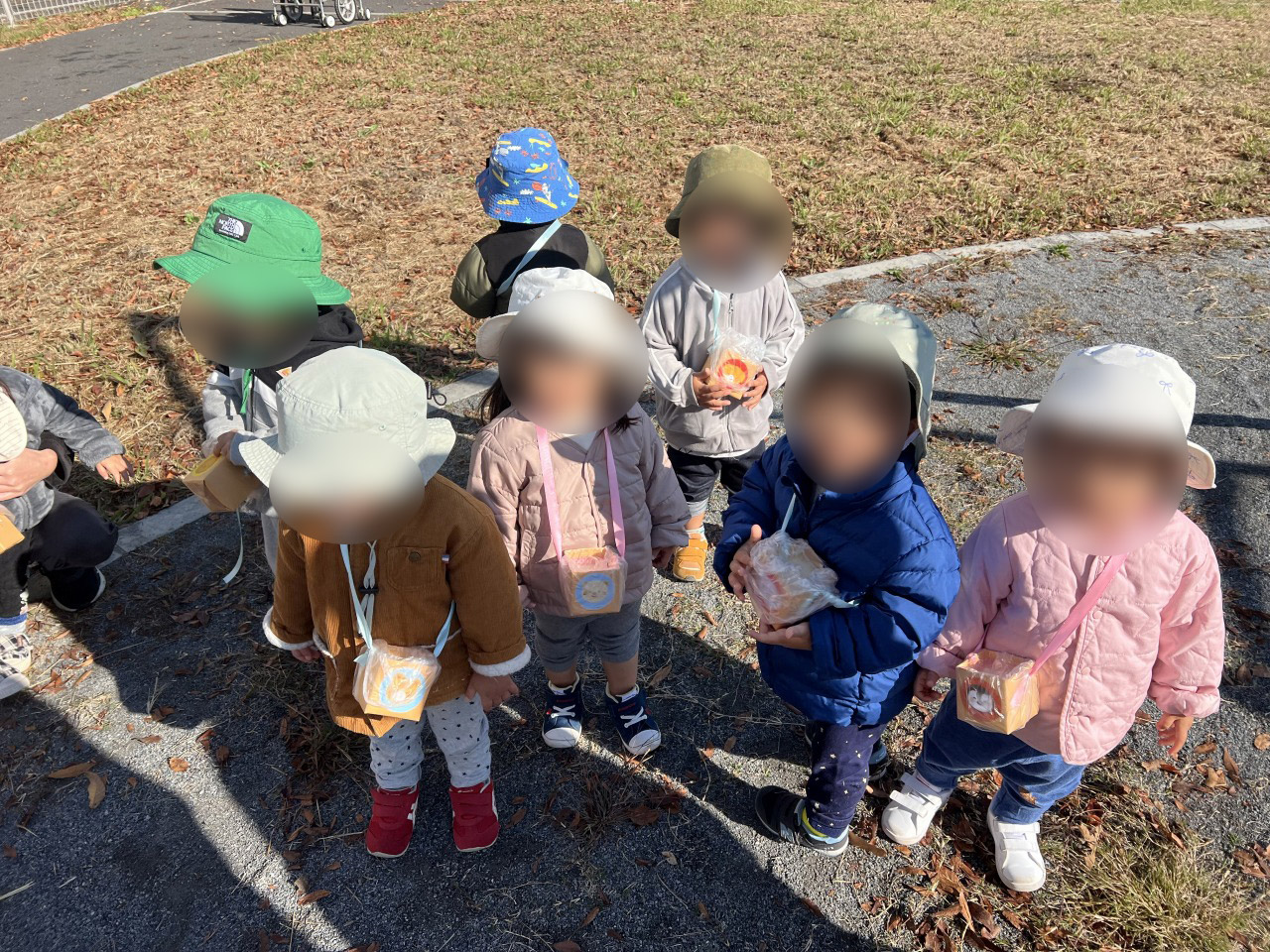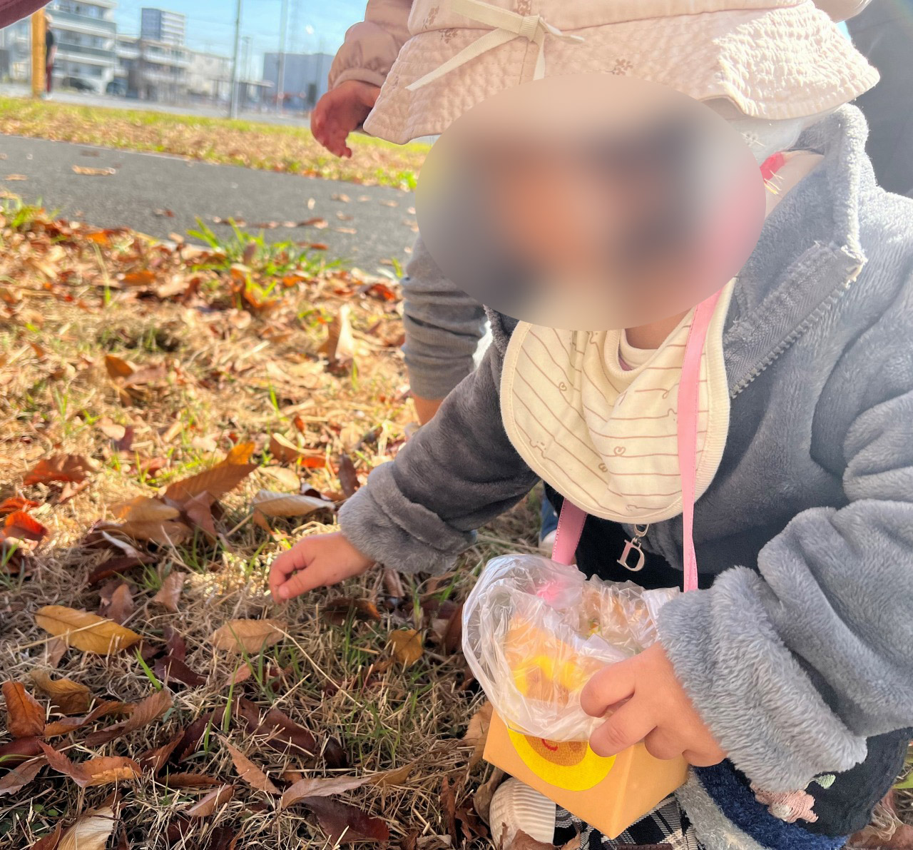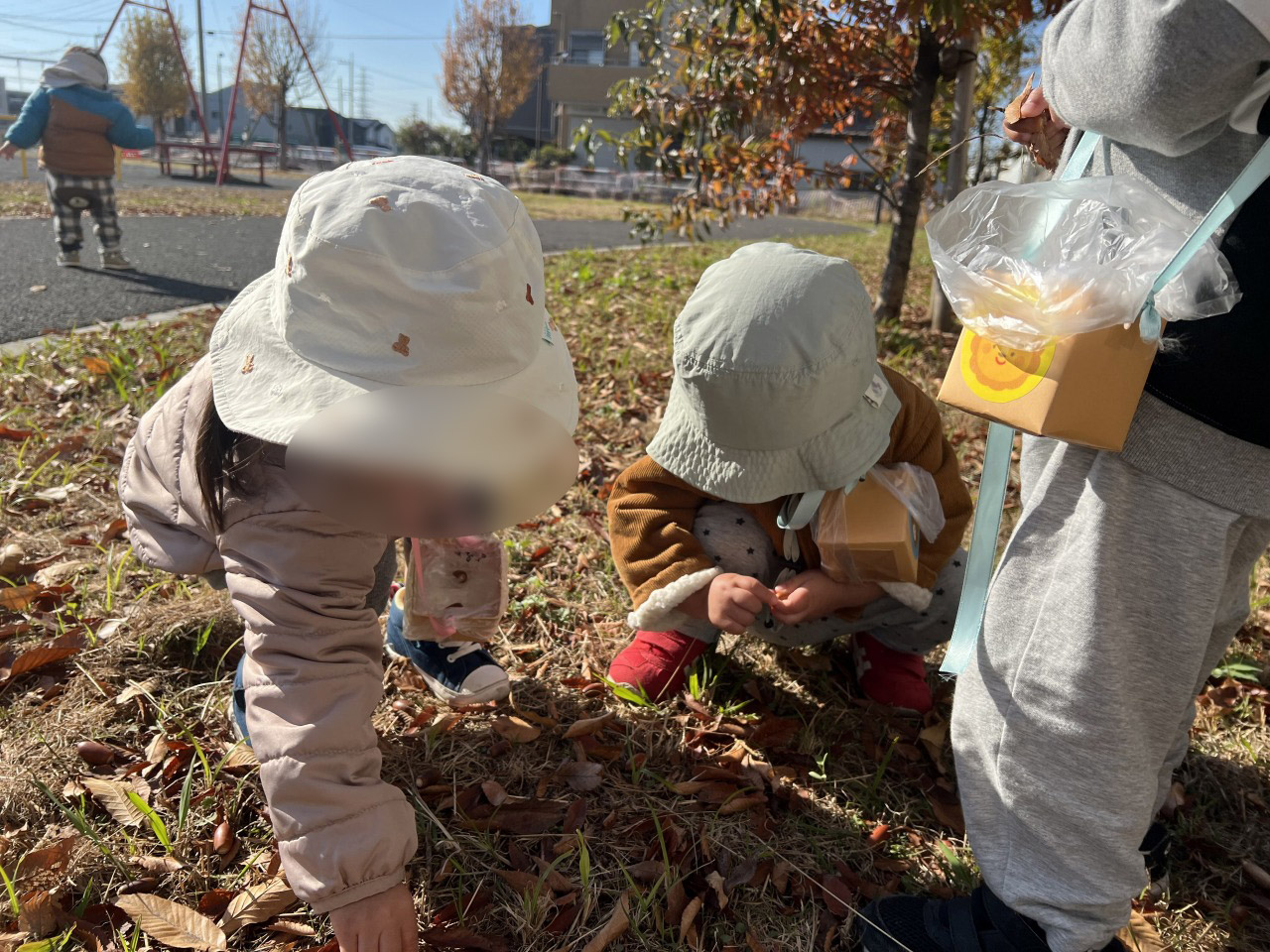 子どもたちは色とりどりの落ち葉やどんぐりを拾って「きれい!」と見せ合ったり、風に舞う葉っぱを追いかけたりして、この時期ならではの自然を楽しんでいました。