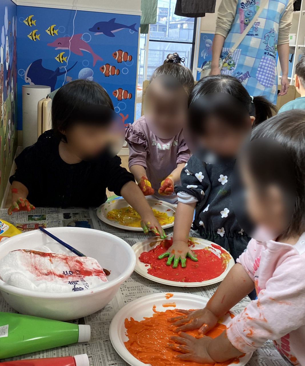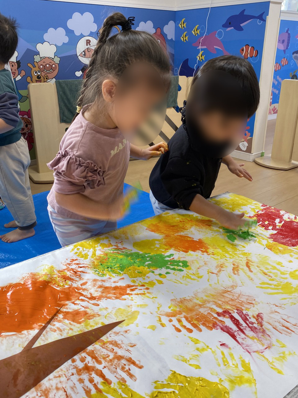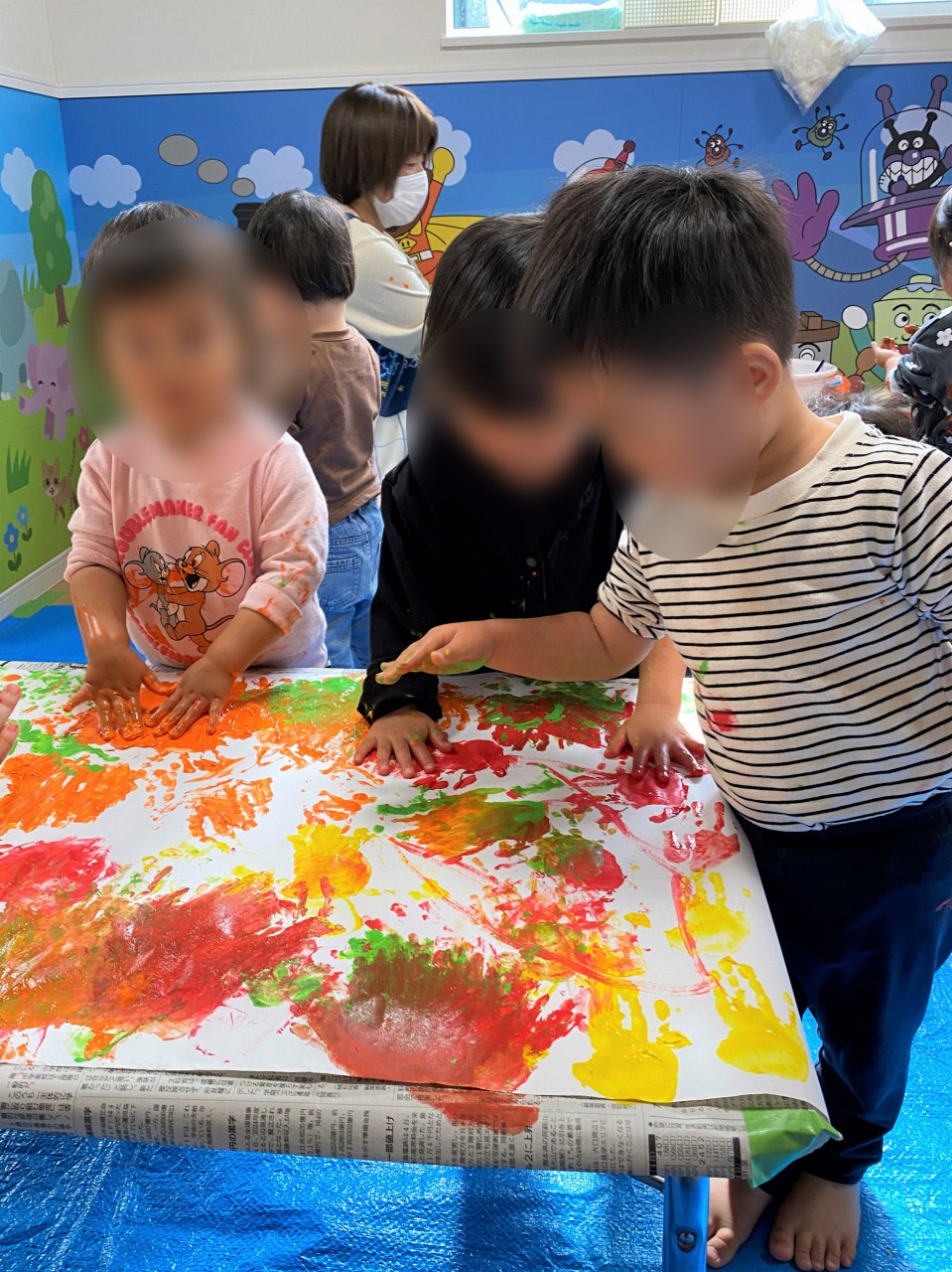 色が混ざっていく様子を楽しんだり、ゆび絵の具の不思議な感触を楽しんだり♪
