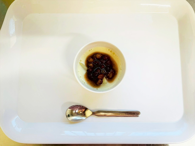おやつは白くま風寒天です。あずきと白桃の相性抜群の寒天ゼリーです。