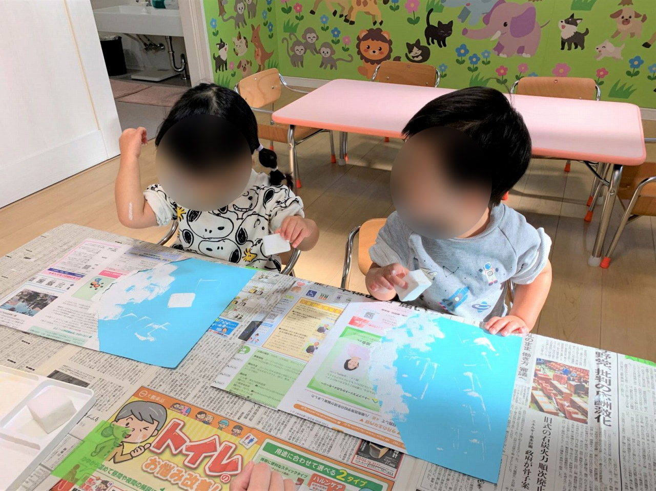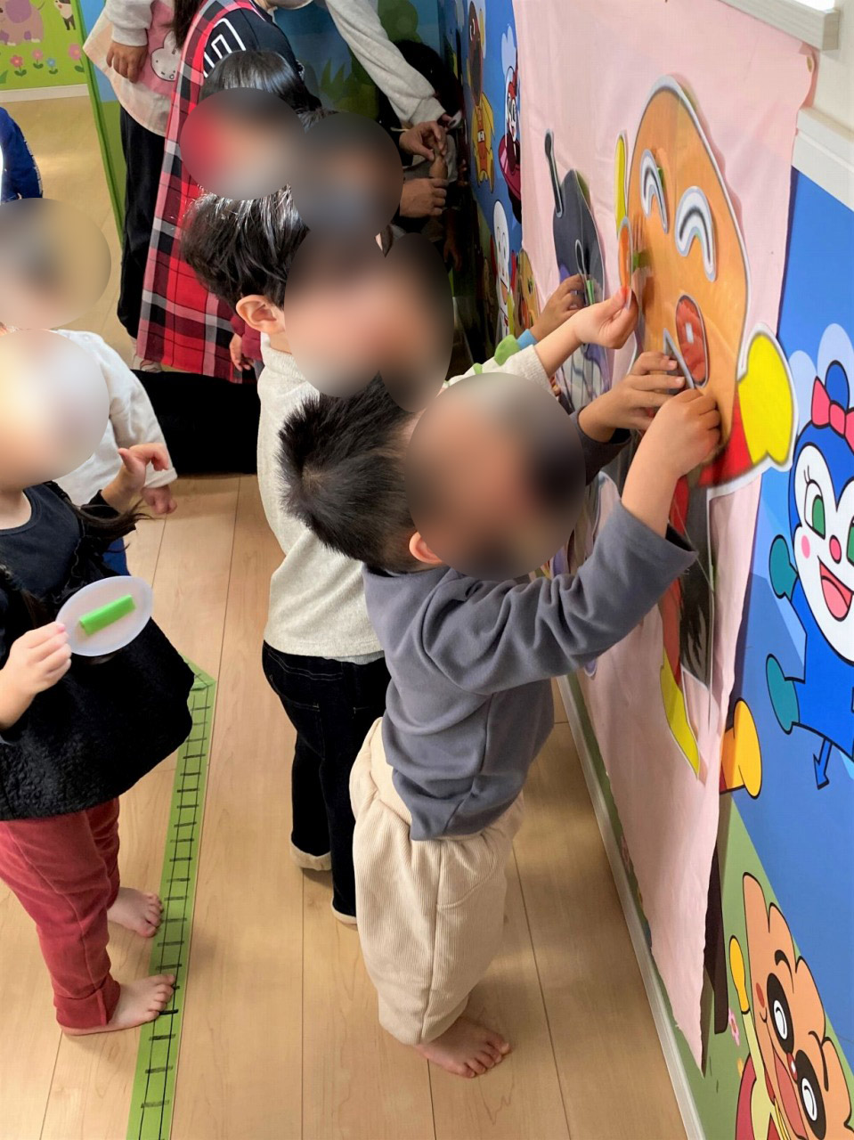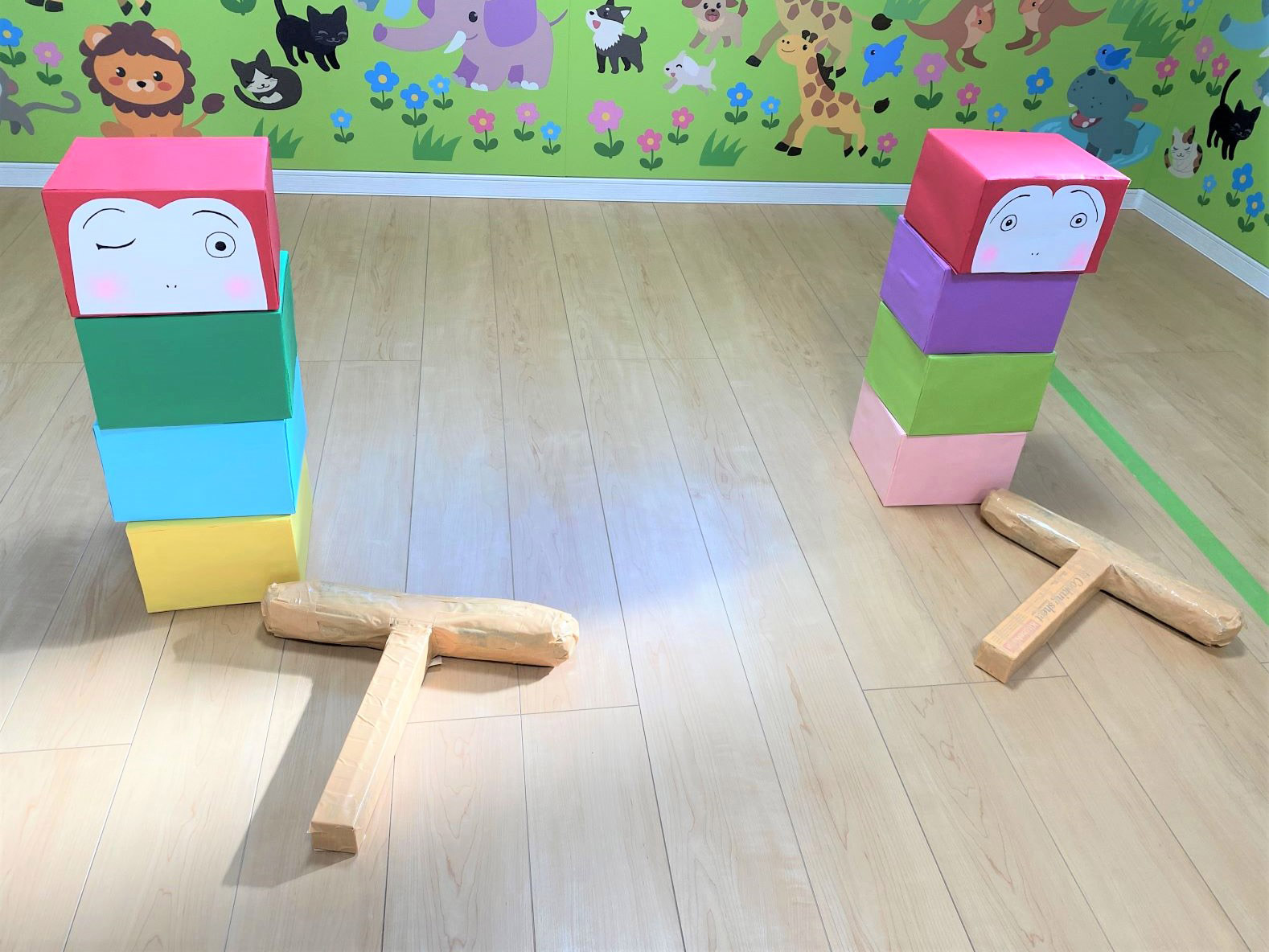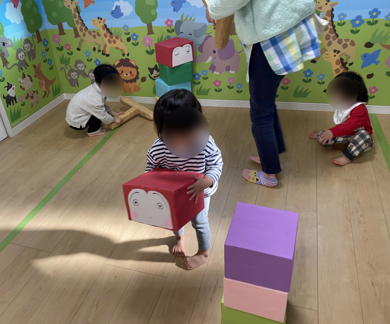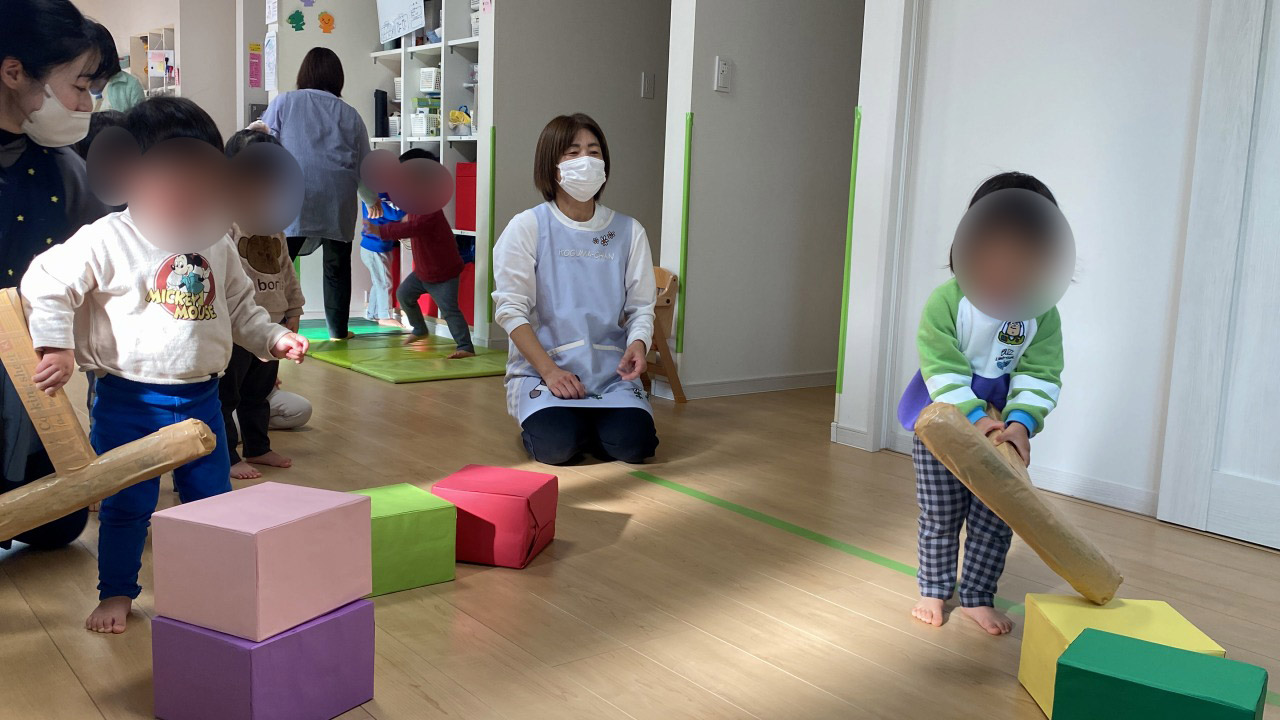横から落としたり、上から叩いてみたり、落としたものを積み重ねたりと自由に楽しみました♪