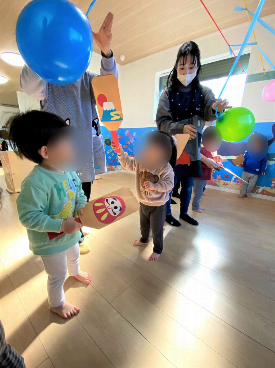 先生お手製のステキな羽子板を持って、動く風船を追いかけます。